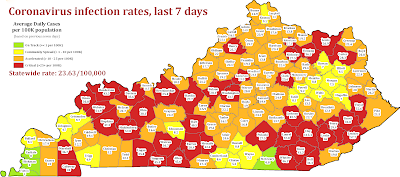 The statewide rate of daily new cases over the last seven days is 23.63 per 100,000 residents, very near the "critical" level of 25. Counties with rates more than double the statewide rate are Clay, 113.4; Jackson, 82.5; Muhlenberg, 57.8; Laurel, 57.8; Letcher, 57.7; Floyd, 52.6; Webster, 51.9; and